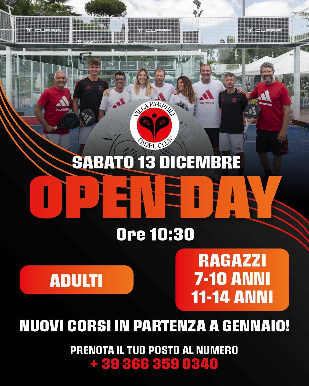 Sabato 13 dicembre alle 10:30 ti aspettiamo al Villa Pamphili Padel Club per il nostro OPEN DAY: